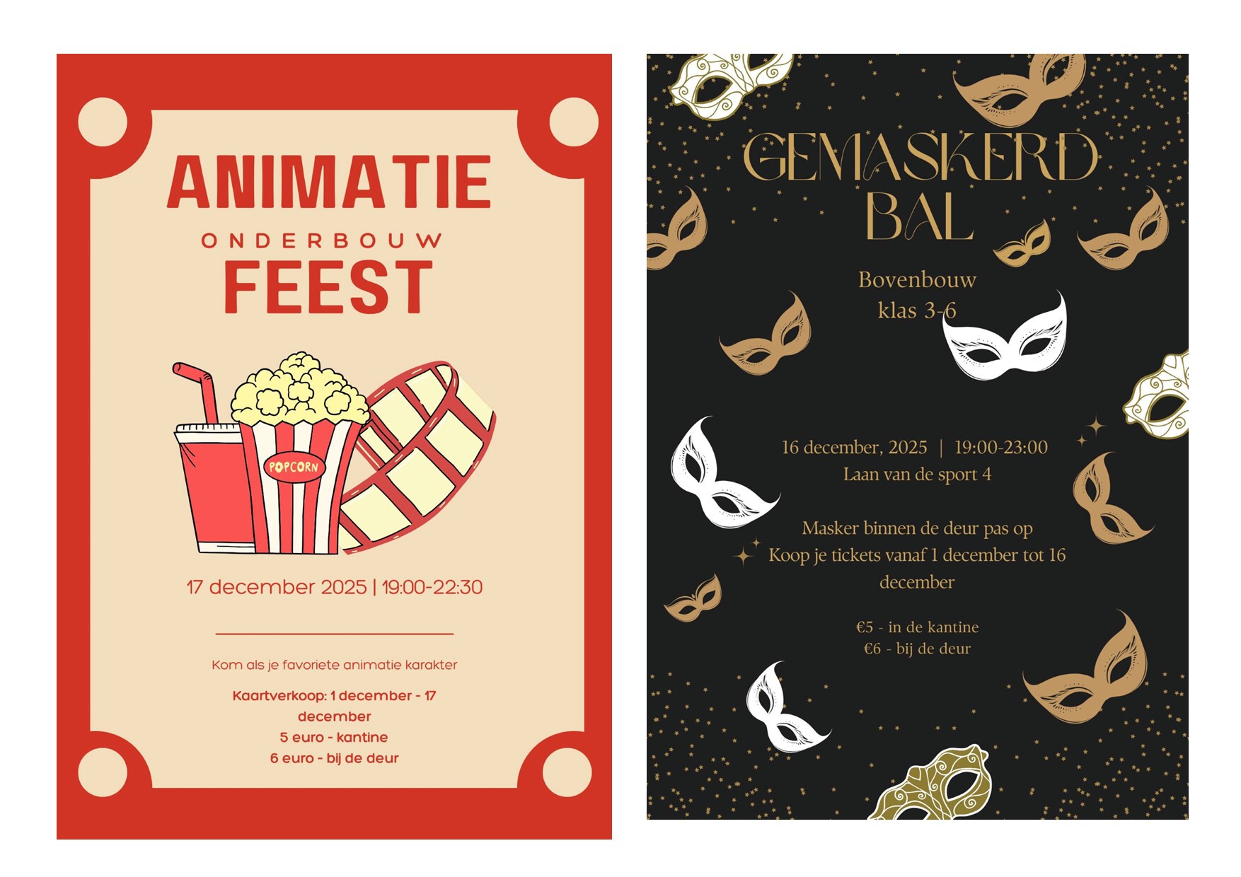 Het bovenbouwfeest staat gepland op dinsdagavond 16 december van 19.00-23.30 uur (de deuren sluiten om 19.30 uur). Hier is gekozen voor het thema “Gemaskerd bal”. Dus kom in je mooiste galajurk of strak in het pak over de rode loper! En zet bij binnenkomst je masker op.
