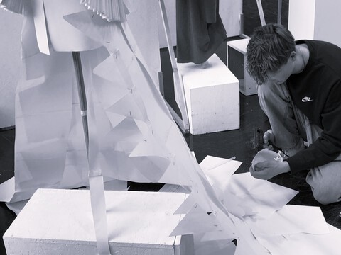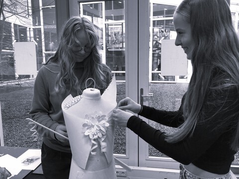 Onze leerlingen uit vwo-5 gingen in opdracht van hun kunstdocent Geert Hoetink in tweetallen aan de slag met het ontwerpen van sculpturale kostuums. Hun vindingrijkheid is tijdens de expositie ZWART/WIT in Slochteren te zien in prachtige witte papieren creaties die ze tijdens de lessen ckv hebben gemaakt. De leerlingen lieten zich inspireren door beroemde modeontwerpers als Iris van Herpen, Viktor & Rolf en Azzedine Alaïa.